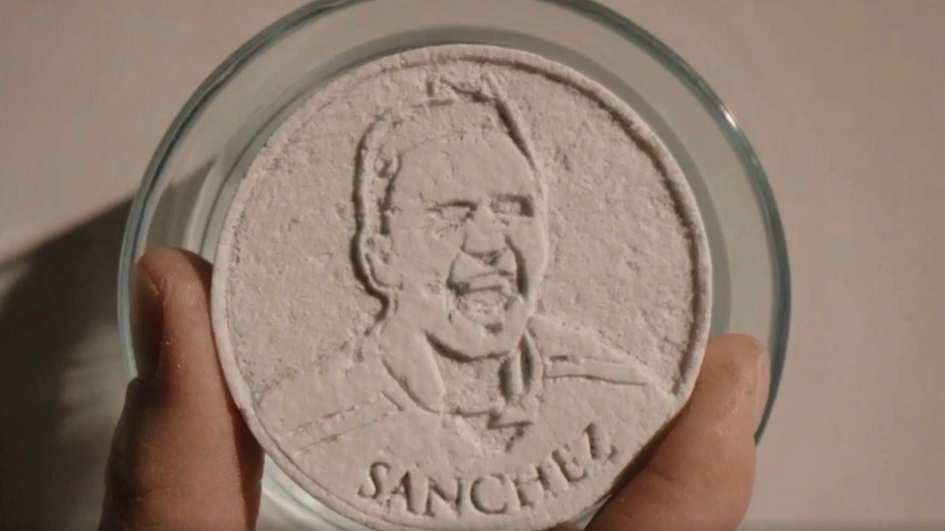 En Disolvencia, Claudio Correa presenta una serie de obras que apelan con un gesto irónico a la relación que se teje entre el éxtasis deportivo, la reducción de la celebridad a su imagen idealizada y la crítica de la cultura de masas en nuestra sociedad contemporánea. Pastillas efervescentes sobre las que han sido grabados los rostros de icónicos personajes del fútbol – leyendas como Lionel Messi, Diego Armando Maradona, Gerard Piqué o Cristiano Ronaldo– se disuelven en agua y simulan el sonido emanado por el frenesí del público que grita al unísono un gol o la victoria de su equipo para irse fundiendo lentamente con el todo. Estas tabletas son contrastadas por una medalla de la diosa alada de la victoria Niké que hace eco a las condecoraciones militares inscritas con la leyenda de “Misión Cumplida” que fueron entregadas durante la dictadura chilena a civiles y militares como reconocimiento por realizar “servicios distinguidos”. En este caso, la medalla premia a los deportistas elegidos por su capacidad para mantener esa figura idealizada en cada momento de su movimiento frente a la ácida mirada del escrupuloso espectador.